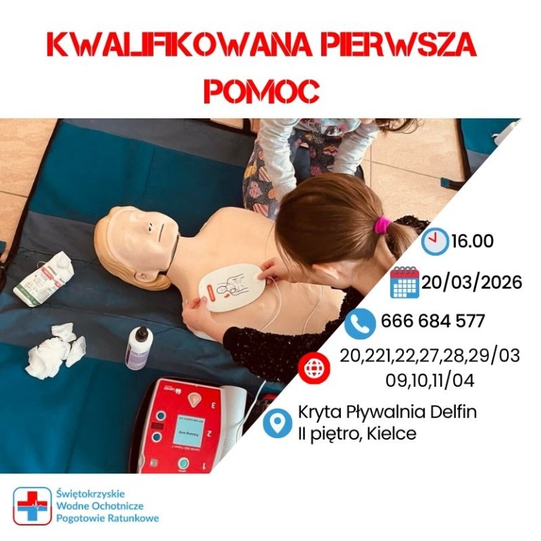 Kurs Kwalifikowanej Pierwszej Pomocy Start: 20/03 g.16.00 Krytwa Pływalnia Delfin II piętro 25-029 Kielce Terminy: 21,22,27,29/03 oraz 09,10,11/04 Koszt: 1100 zł Zapisy: 666 684 577 ...